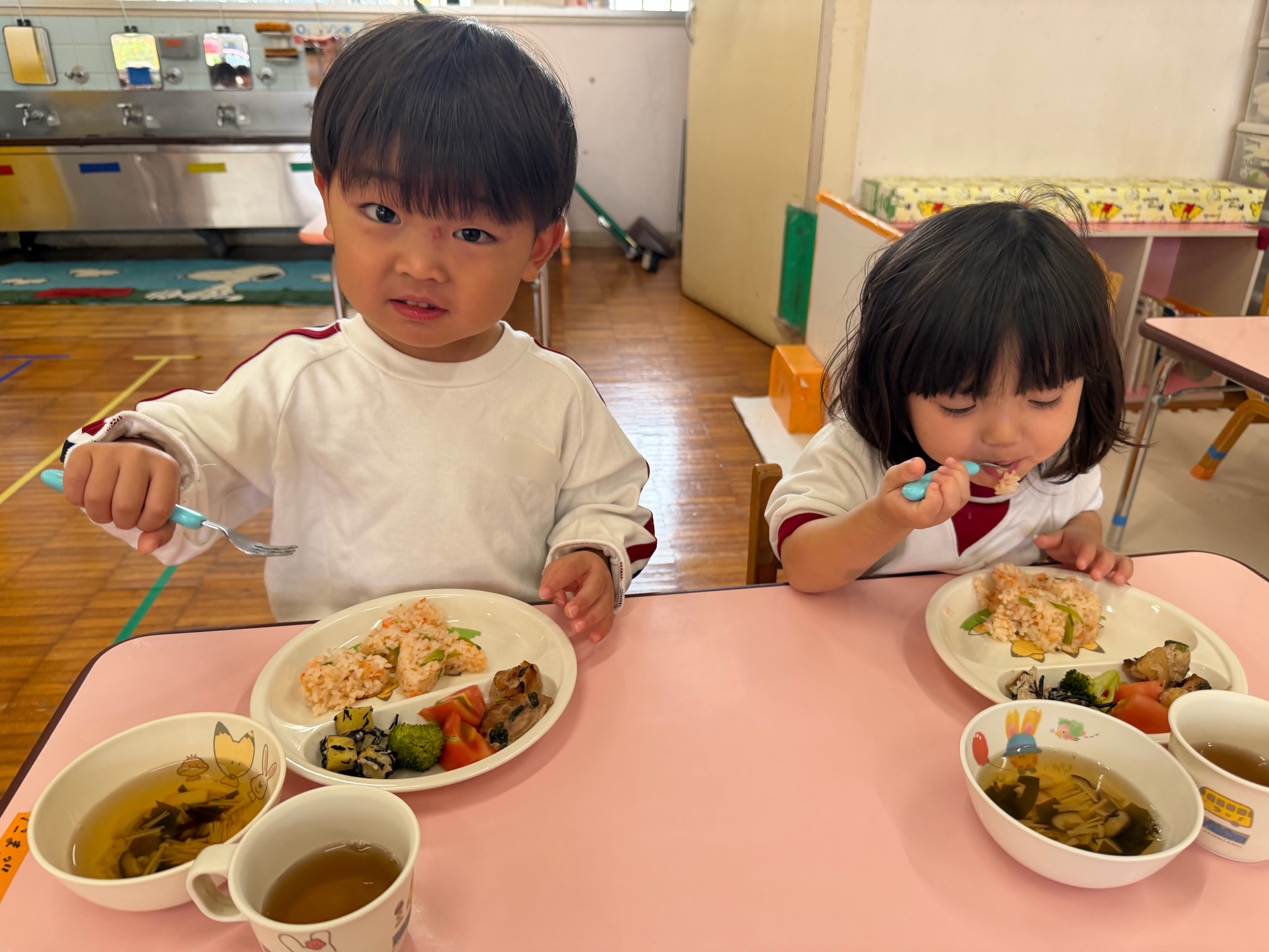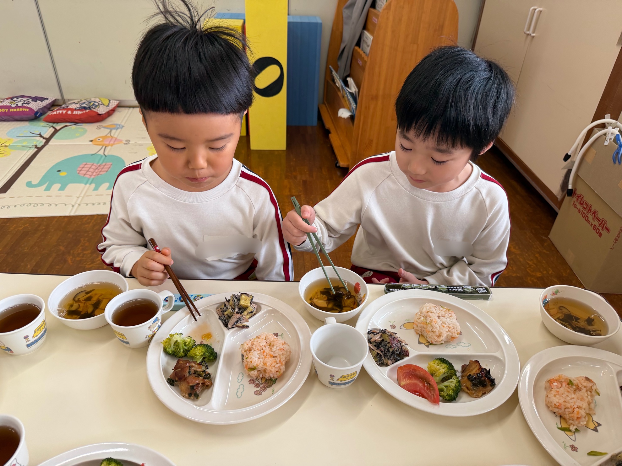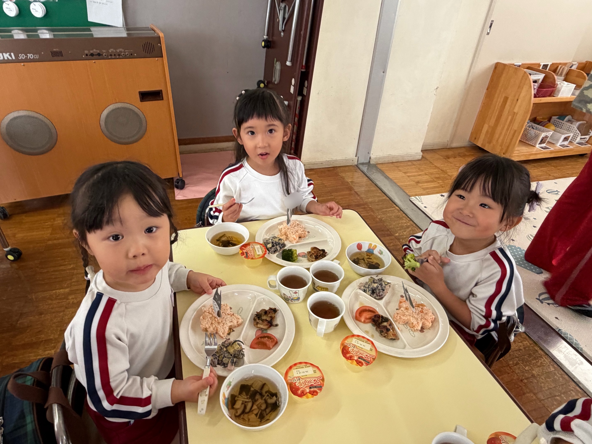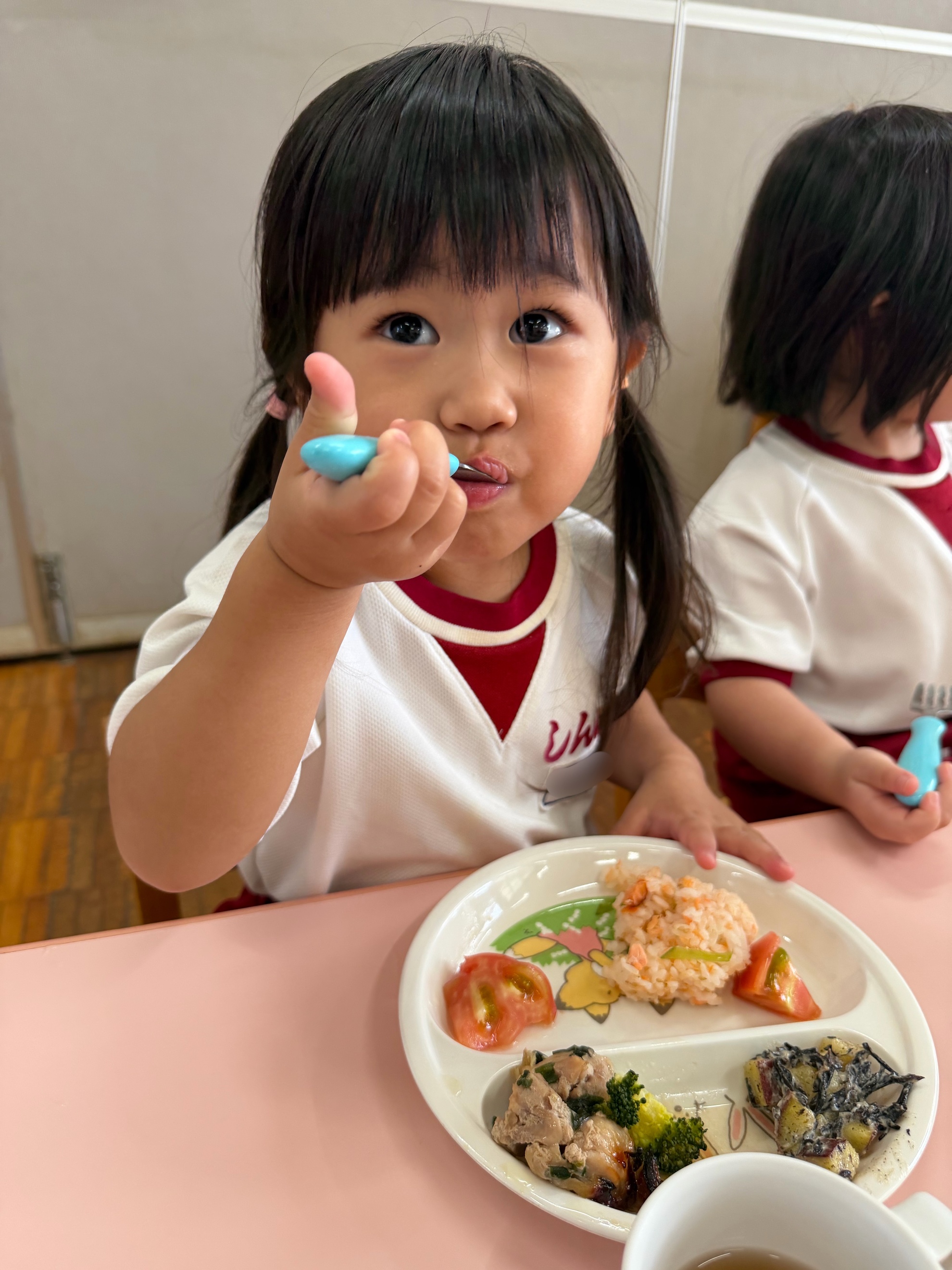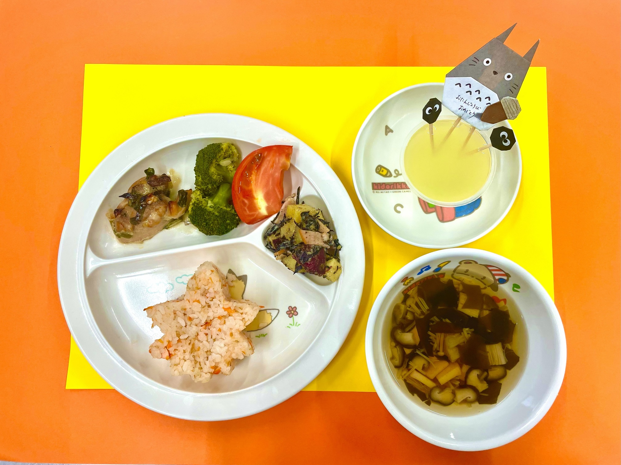 誕生会特別メニュー🎂 みんなわくわくの誕生会の日の特別メニュー♪ ・鮭ごはん ・鶏の香味焼き ・ゆでブロッコリー ・トマト ・さつまいもとひじきのサラダ ・清汁 ・りんごゼリー 「このさつまいもはきくぐみ、ゆりぐみが掘ったさつまいもじゃない?」 子どもたちの目がキラキラ♪ 「おいしー!」 ニコニコ笑顔がこぼれました! カテゴリー: 投稿日:2025年11月12日 次へ