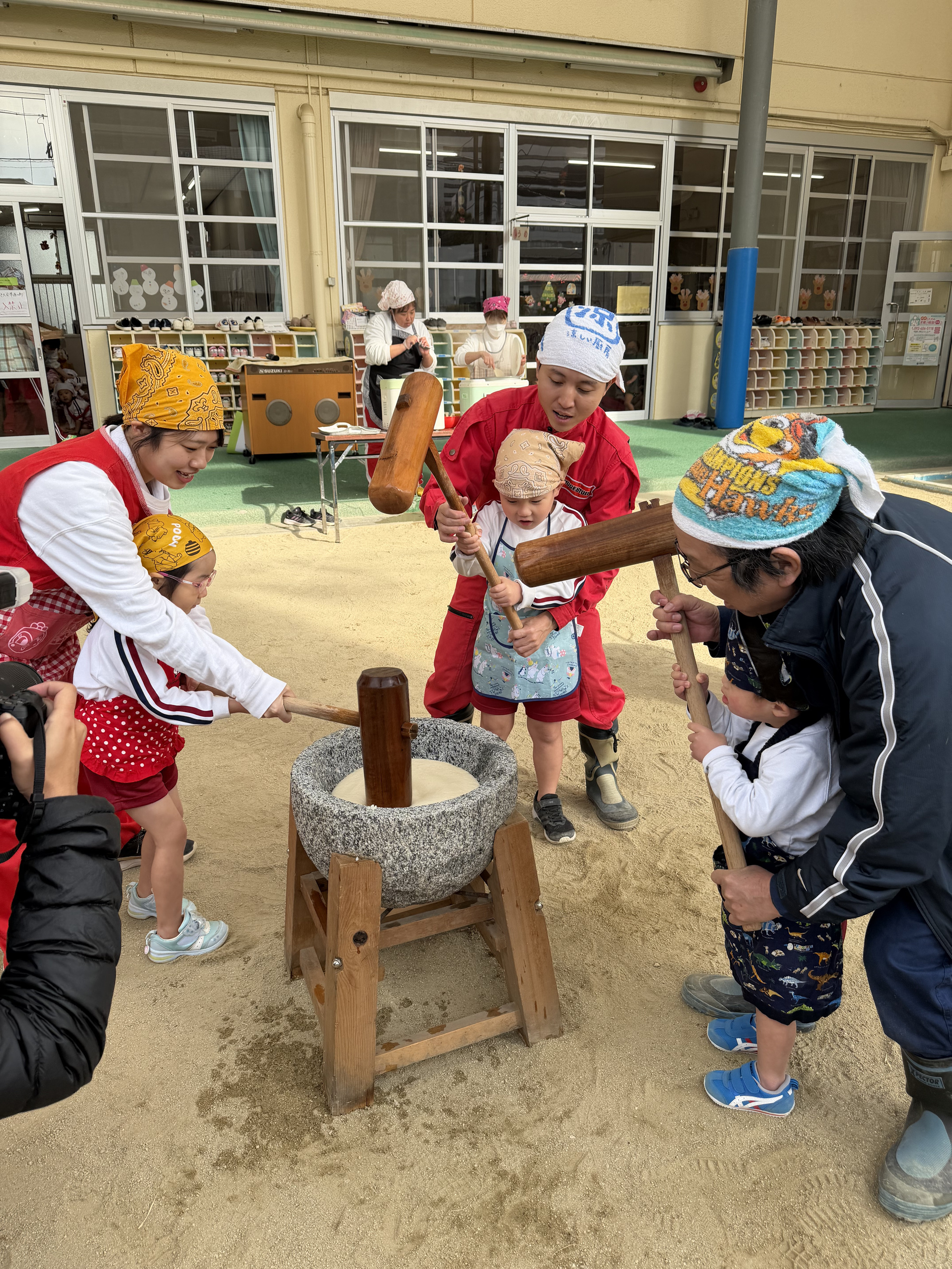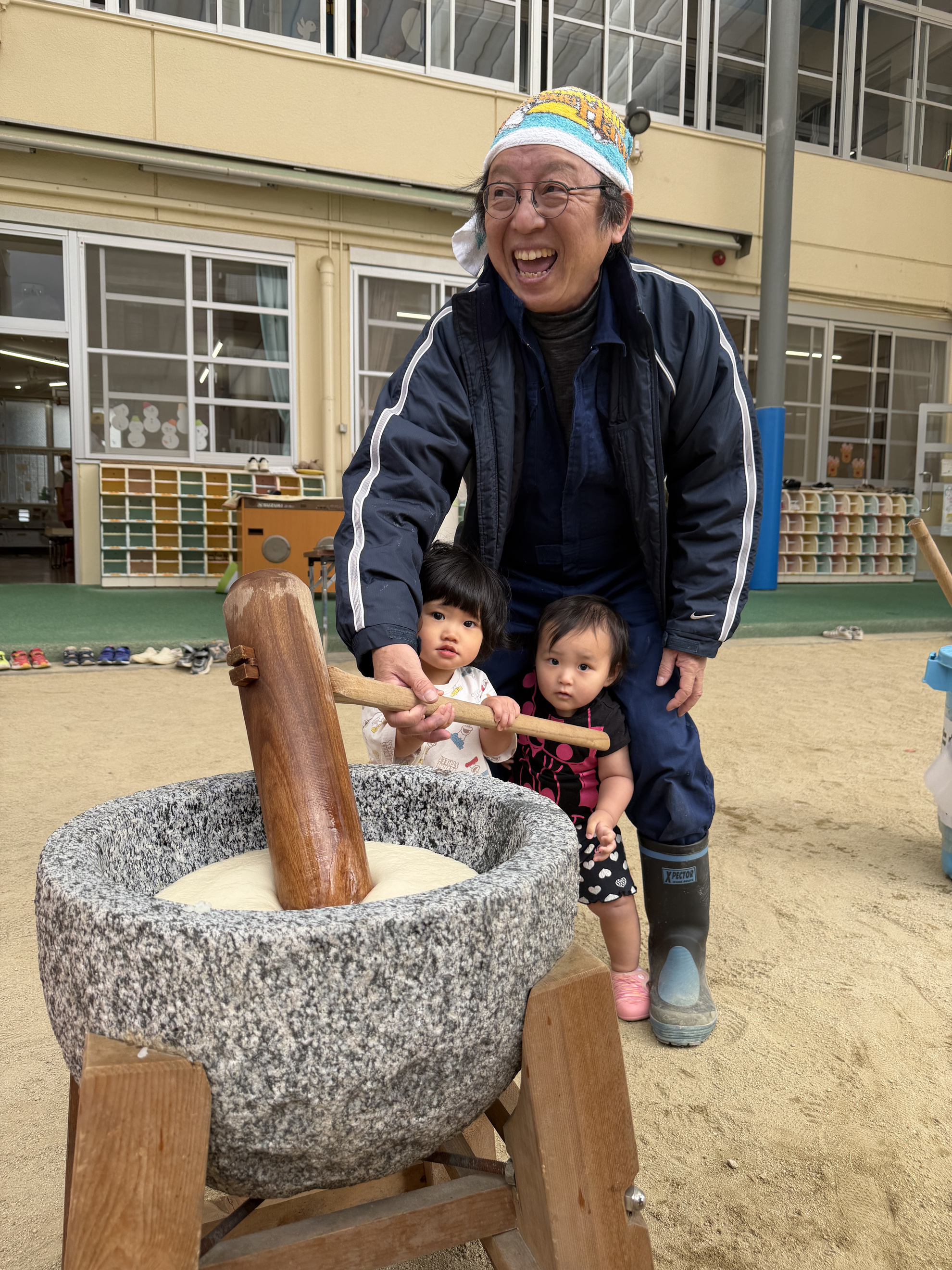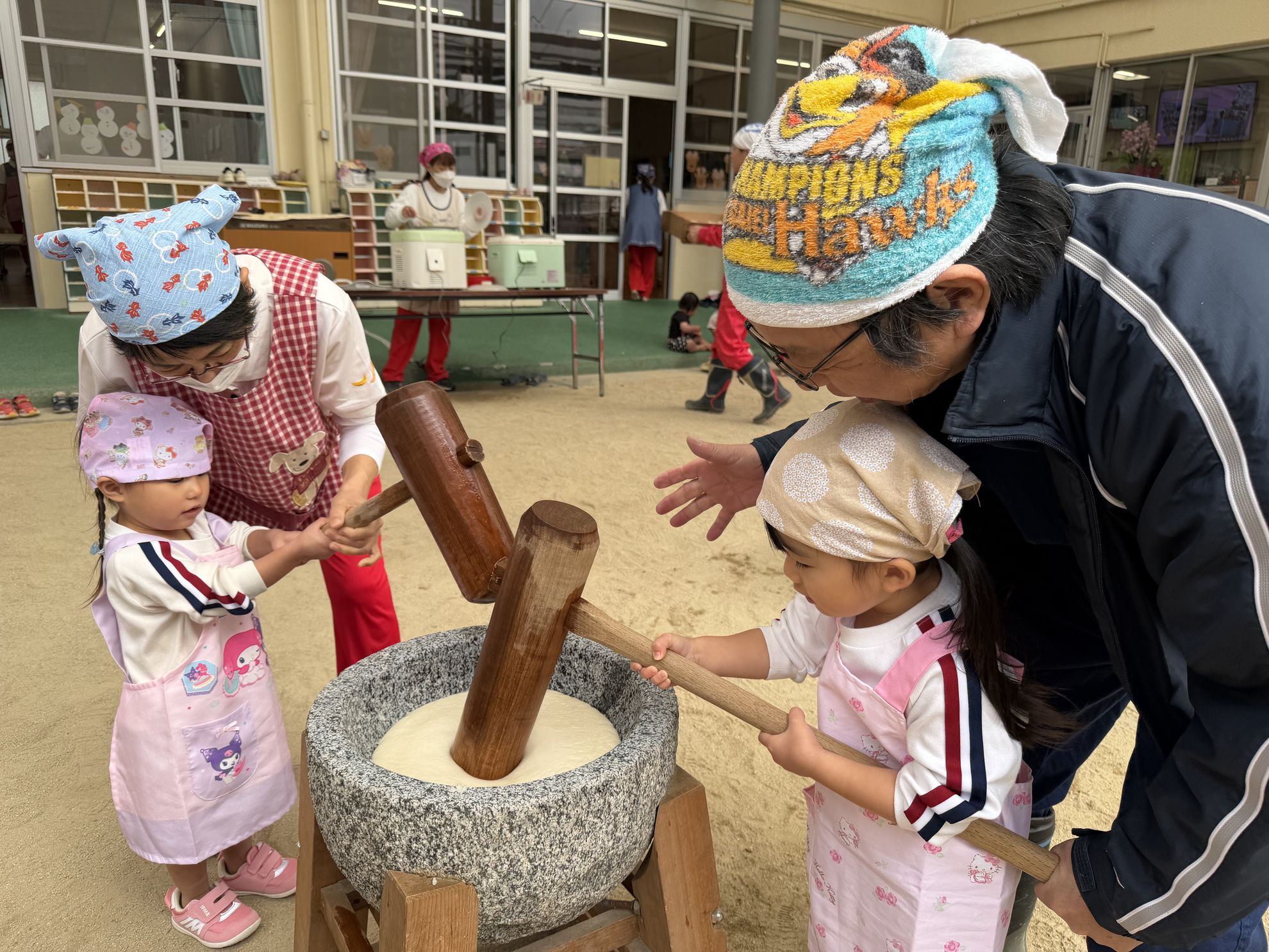 もちつき大会 もちつき大会を行いました。 おもちって、何からできてるか、知ってるかな? もち米を蒸すとこんな感じ。 「ごはんのにおいがする~」 「けむりがでてるよ~(湯気)」 みんな身を乗り出して見ています。 みんなの背の高さか、それ以上ありそうな杵を持って、 臼の中に入っているもち米をついていきます。 「よいしょ~!」 しっかり力を入れて。 「よいしょ~!」 みるみるうちにお米からおもちに✨ こねこね。 みんなで丸めました。 もちつきの順番を待ってる間は、 腕相撲と、相撲も楽しみました。 カテゴリー: 投稿日:2025年12月03日 次へ
