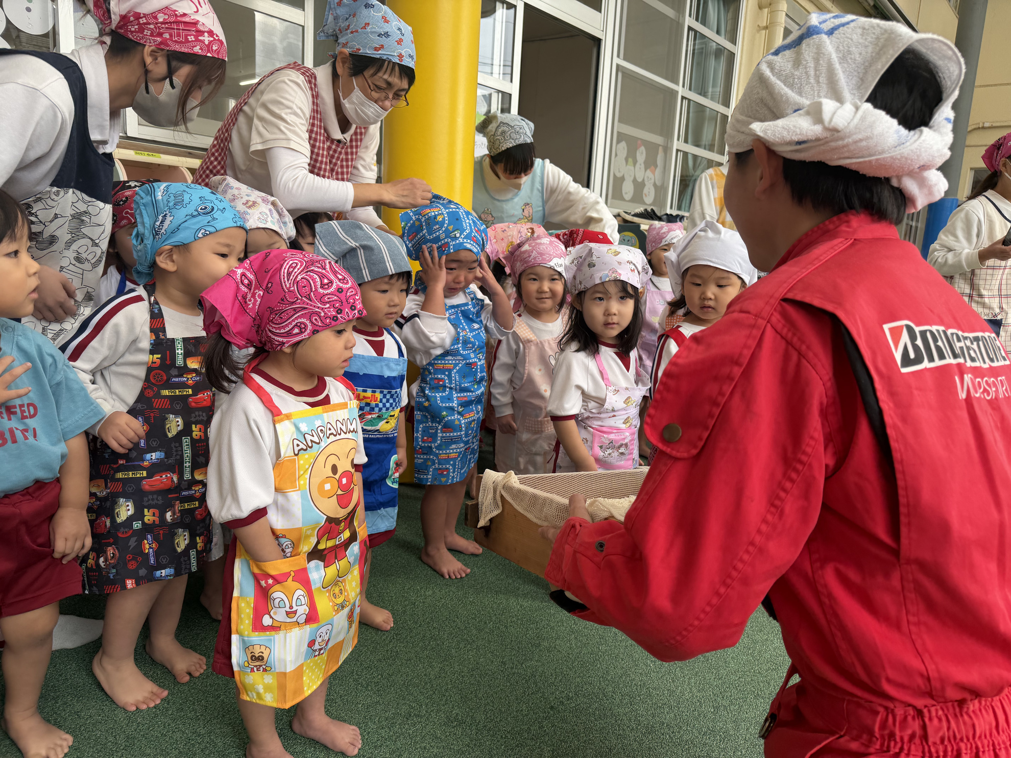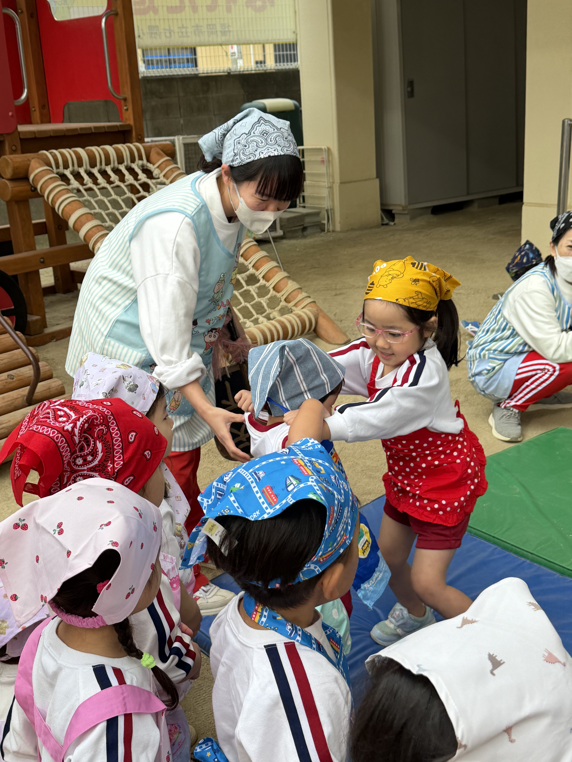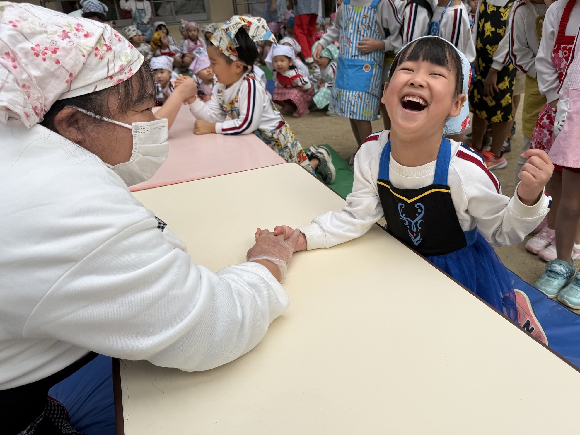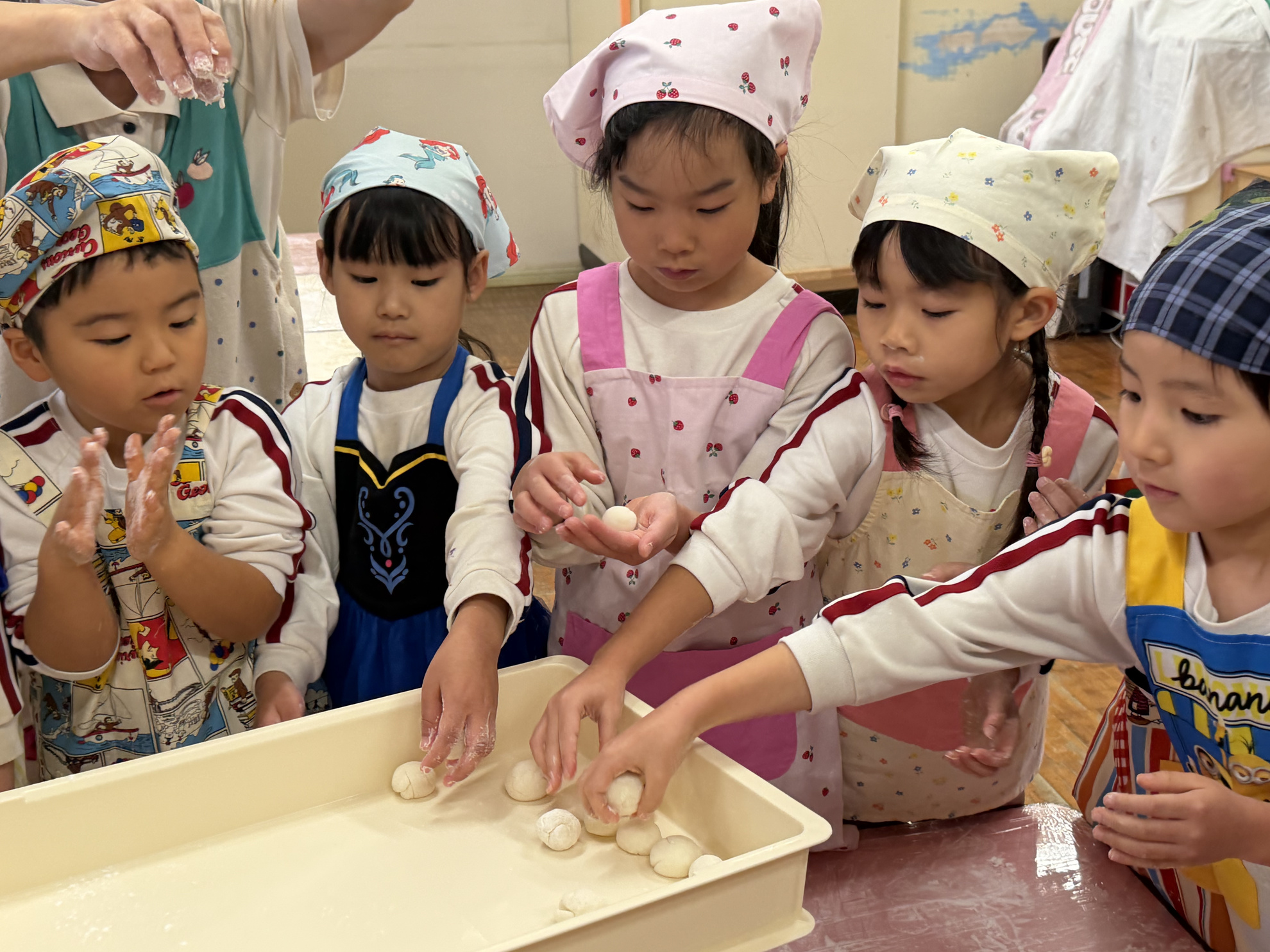もちつき大会 もちつき大会を行いました。 おもちって、何からできてるか、知ってるかな? もち米を蒸すとこんな感じ。 「ごはんのにおいがする~」 「けむりがでてるよ~(湯気)」 みんな身を乗り出して見ています。 みんなの背の高さか、それ以上ありそうな杵を持って、 臼の中に入っているもち米をついていきます。 「よいしょ~!」 しっかり力を入れて。 「よいしょ~!」 みるみるうちにお米からおもちに✨ こねこね。 みんなで丸めました。 もちつきの順番を待ってる間は、 腕相撲と、相撲も楽しみました。 カテゴリー: 投稿日:2025年12月03日 次へ