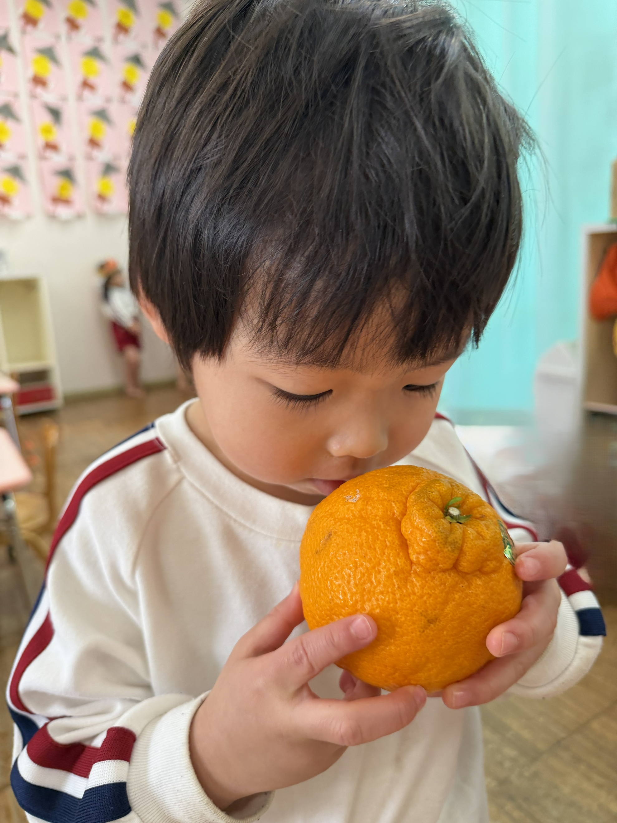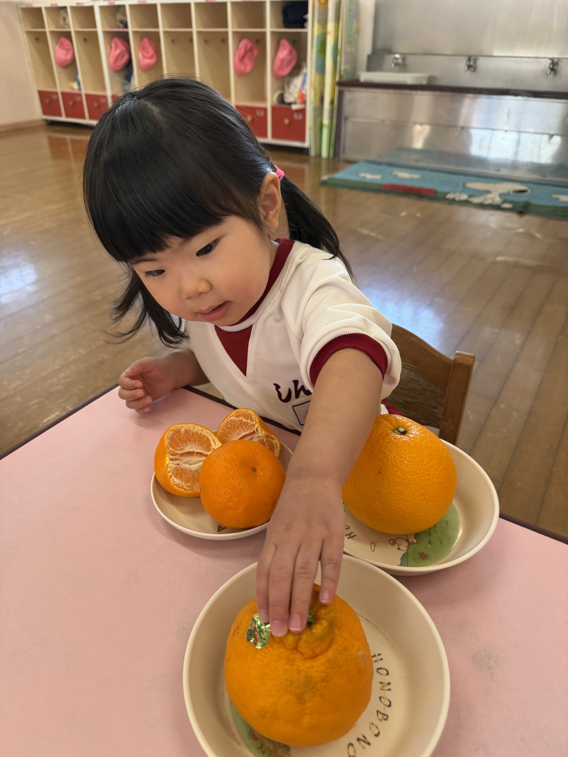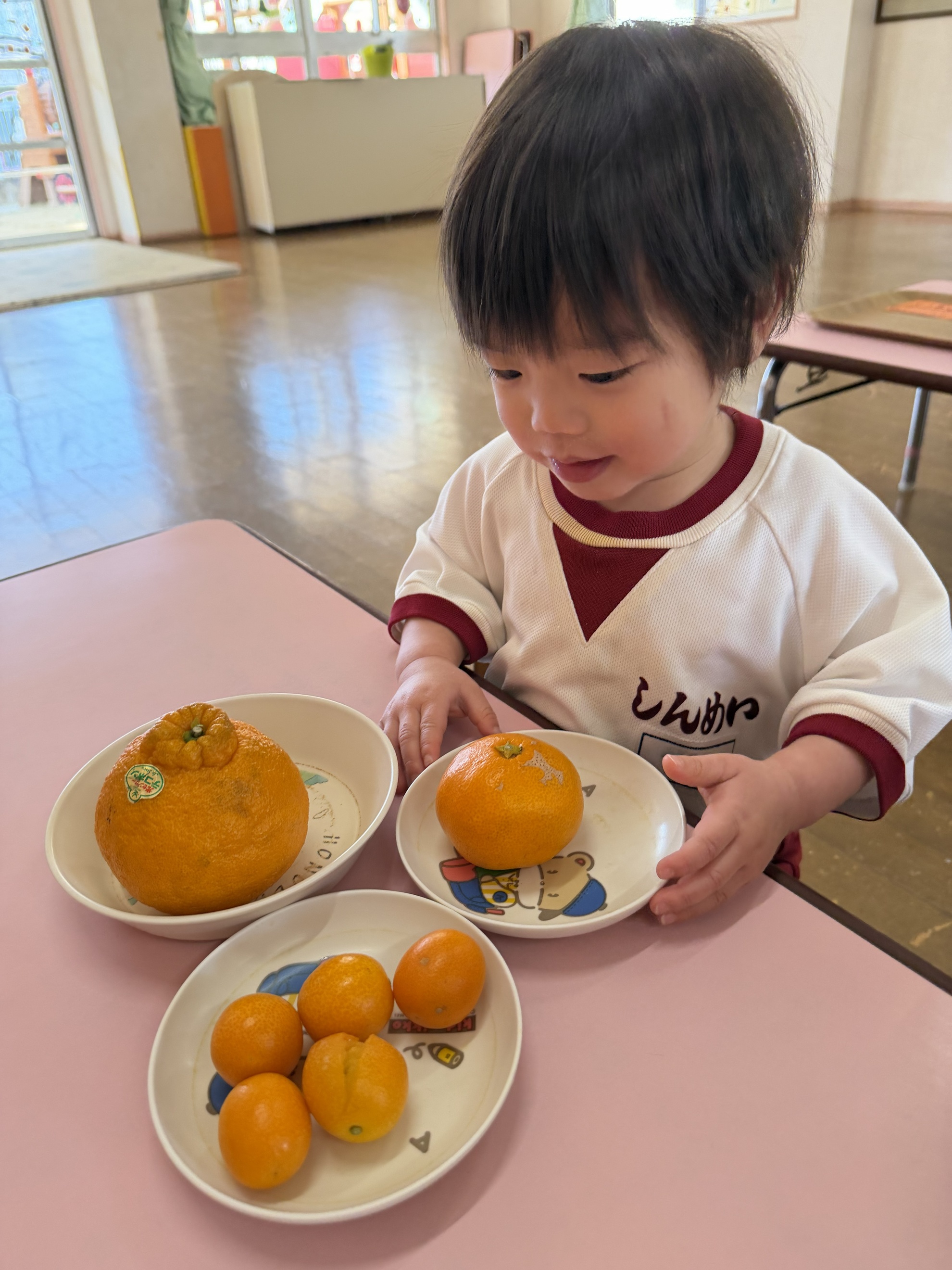 いろいろみかん 今月の食材見せは「みかん」。 いろいろなみかんを見たよ。 「わあ!大きいみかん!!」 ころころころ~ ぼくでもふたつ持てちゃうサイズ☆ ちっちゃいみかんだね。 どのみかんが好きかなぁ~? わたしはこれかな! 匂いを嗅いでみよう! どんなにおいがする?? カテゴリー: 投稿日:2026年02月17日 前へ次へ