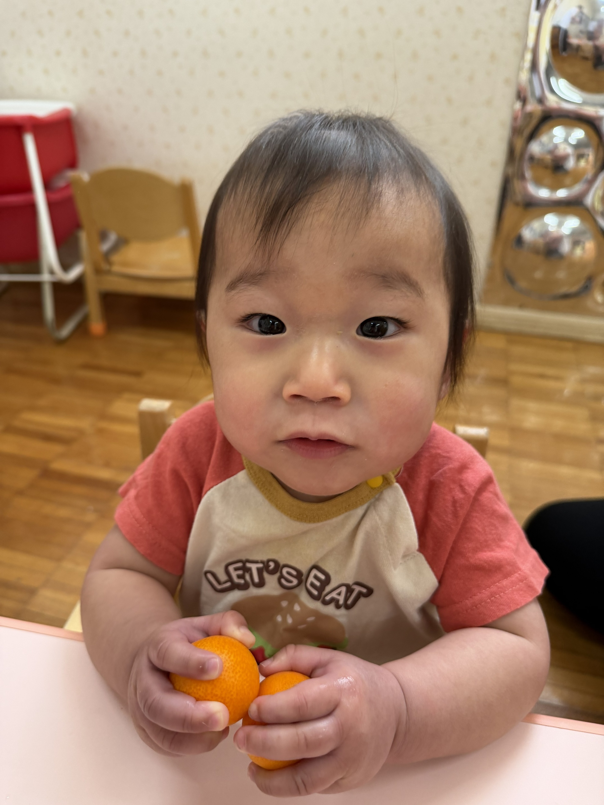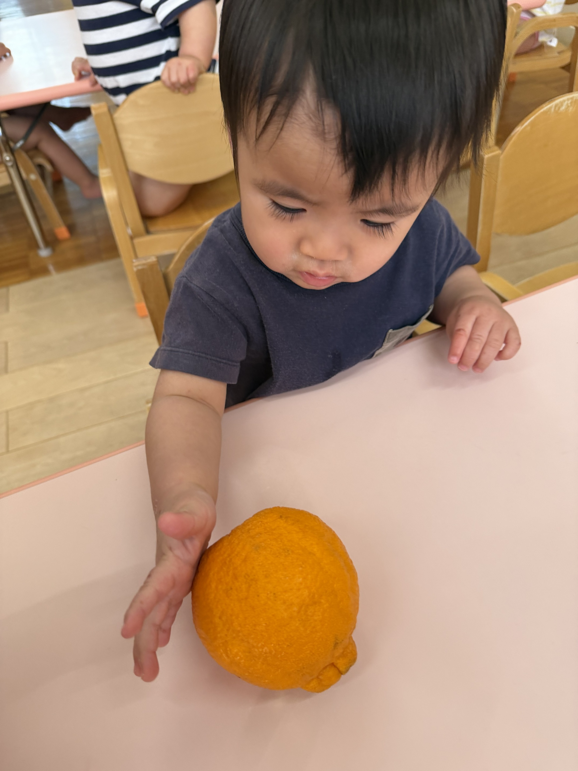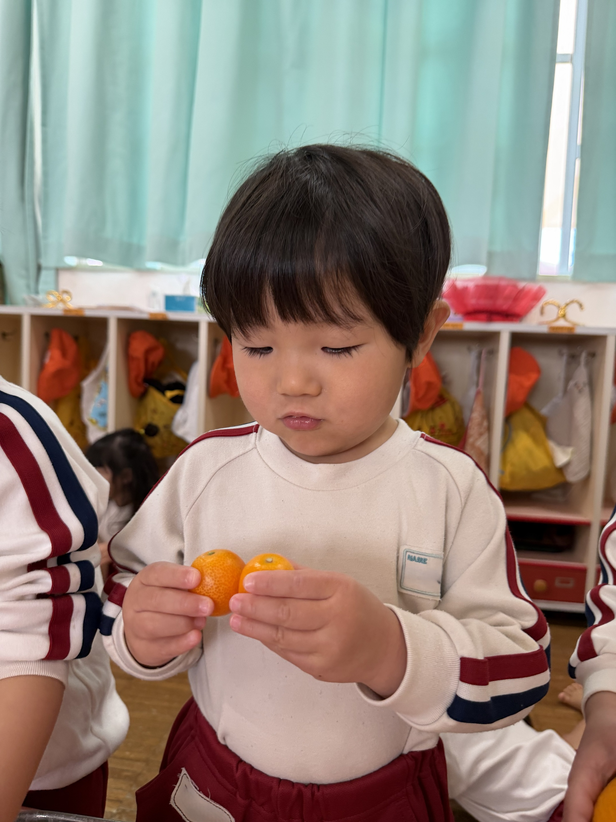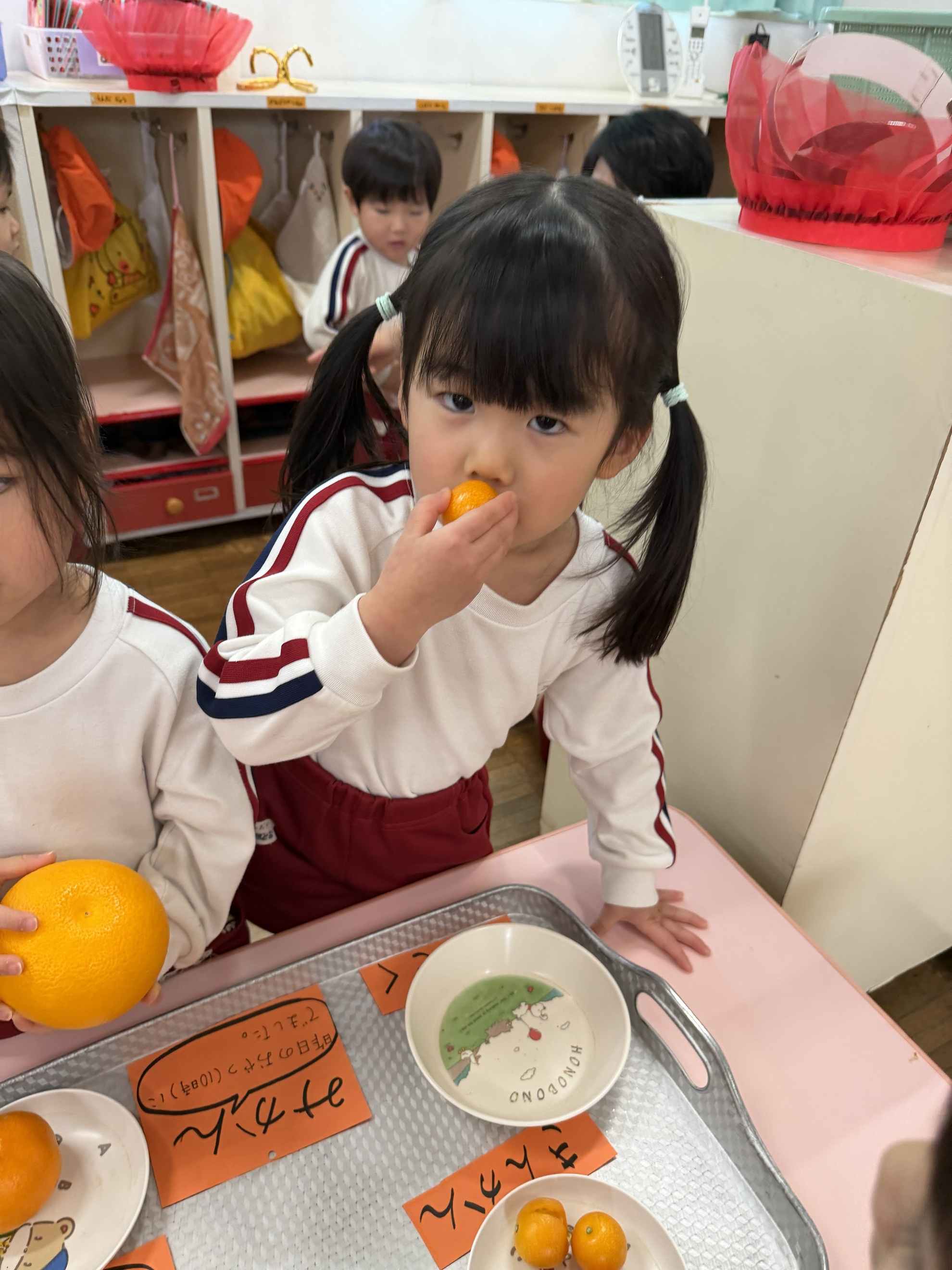 いろいろみかん 今月の食材見せは「みかん」。 いろいろなみかんを見たよ。 「わあ!大きいみかん!!」 ころころころ~ ぼくでもふたつ持てちゃうサイズ☆ ちっちゃいみかんだね。 どのみかんが好きかなぁ~? わたしはこれかな! 匂いを嗅いでみよう! どんなにおいがする?? カテゴリー: 投稿日:2026年02月17日 前へ次へ